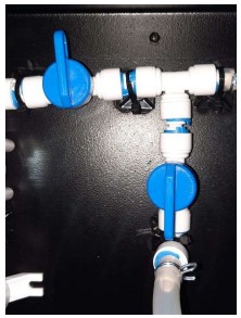 - Автомат запустит процесс заполнения системы. После заполнения системы вода через миксер №1 и шланг начнет литься в емкость для слива. Дождитесь завершения процесса.