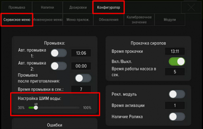 После изменения настройки ШИМ обязательна калибровка воды для правильного расчета дозировок напитков.