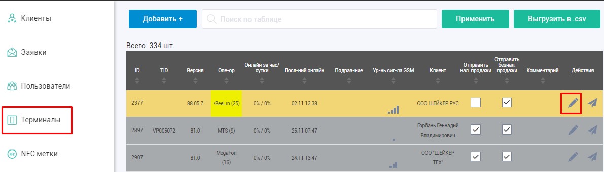 После оформления документов и одобрения заявки банк пришлет номер TID, который нужно назначить терминалу. Для этого на портале Vendista откройте вкладку "Терминалы", напротив нужного нажмите кнопку карандаш. В поле TID выберите один из номеров и сохраните настройки. После этого терминал готов принимать платежи.