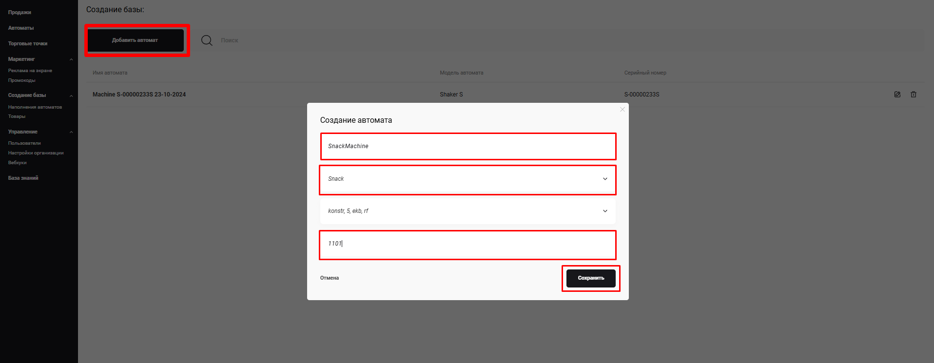 - Добавить в эту ТТ новый автомат - модель Snack, название и с/н - произвольные;