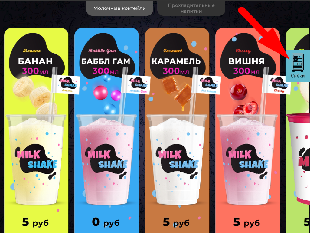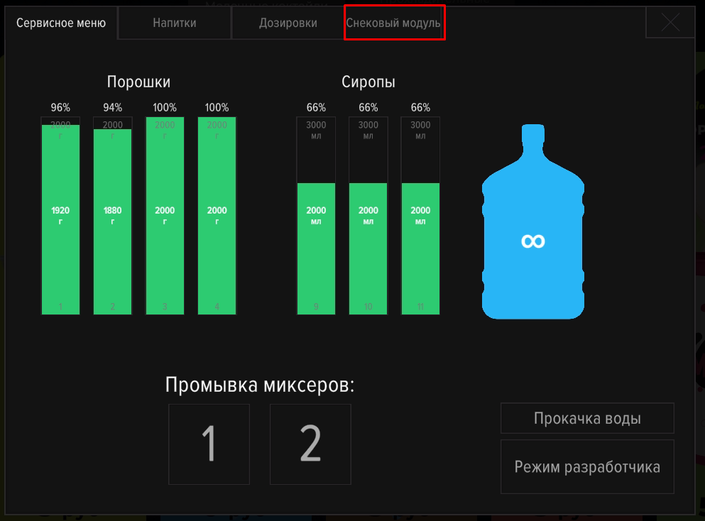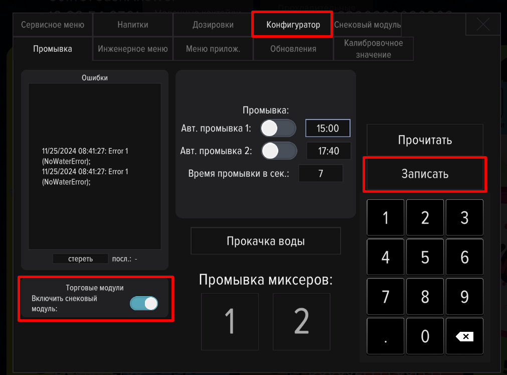 - Повторно откройте сервисное меню. Во вкладке «Конфигуратор» включите опцию "Включить снековый модуль". После этого на экране выбора напитков появится кнопка, открывающая пинпад выбора товаров.