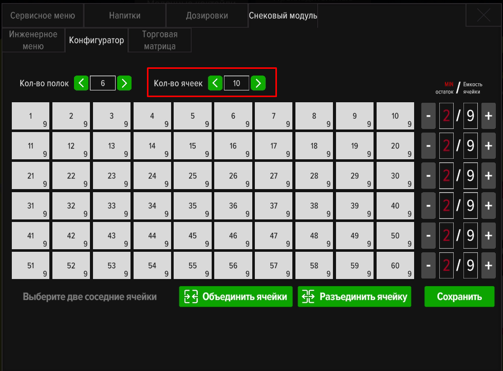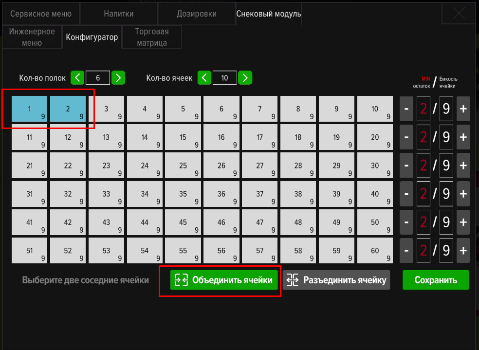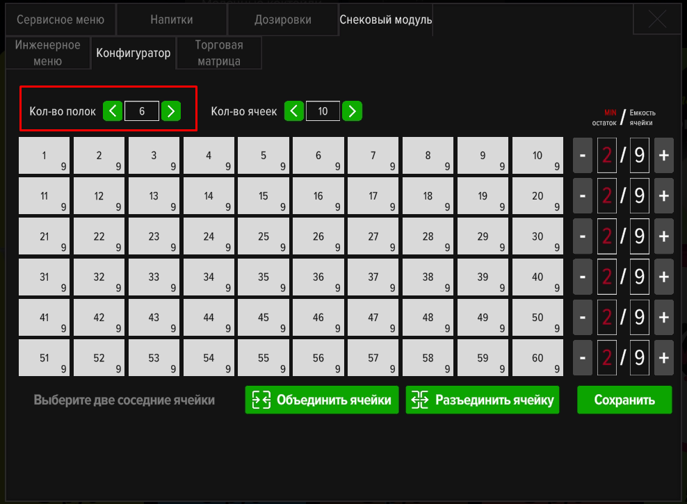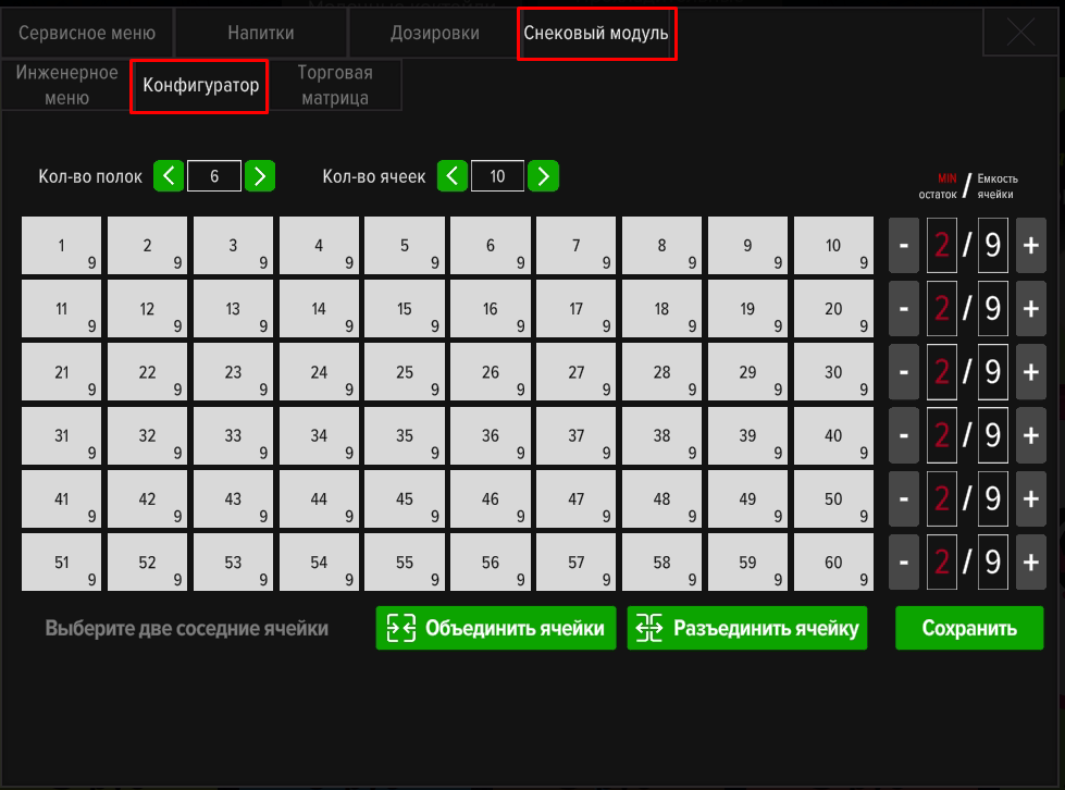 Настройка конфигурации полок и ячеек