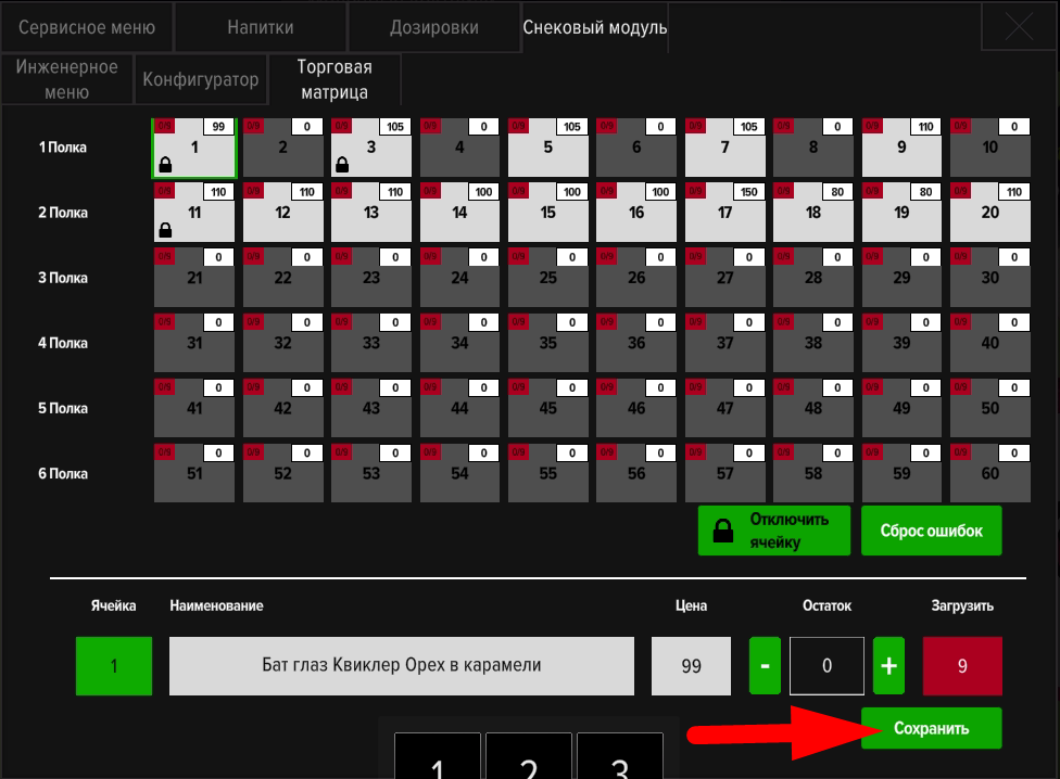 Откройте сервисное меню автомата и перейдите во вкладку «Снековый модуль». Откройте подвкладку «Торговая матрица».