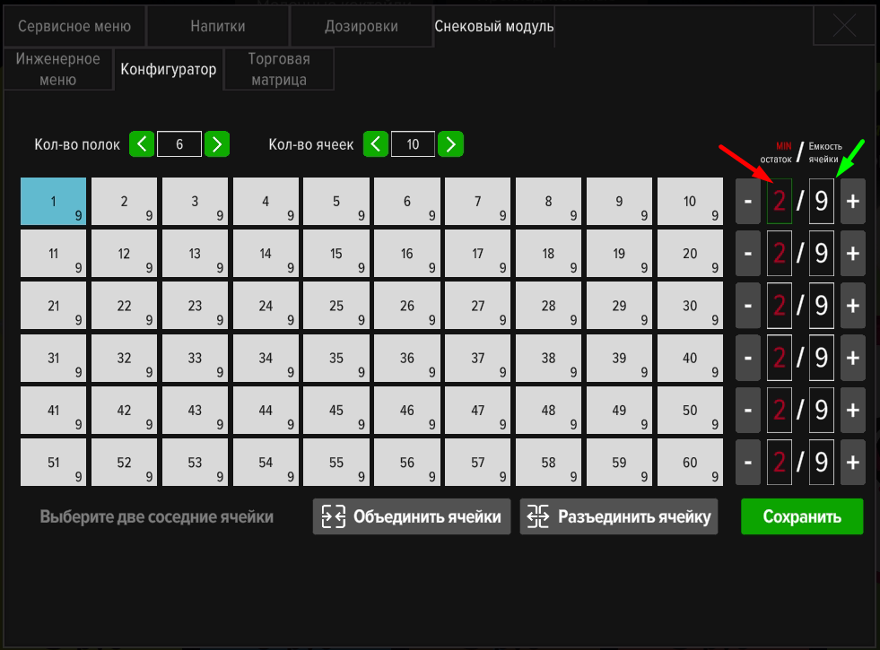 Для настройки емкости ячейки и минимального остатка, при котором ячейка будет исключаться из продажи - выберите нужную ячейку, нажмите на цифру «MIN остаток» или «Емкость ячейки» (подсветится зеленым). Увеличьте значение нажимая «+» или уменьшите, нажимая «-».