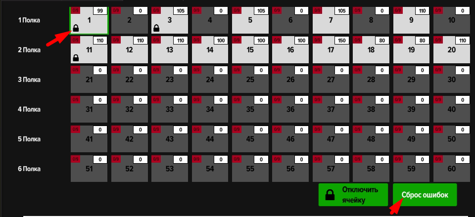 Отключенные ячейки или ячейки с ошибкой выдачи помечаются значком замка. Для включения ячейки нажмите "Сброс ошибок".