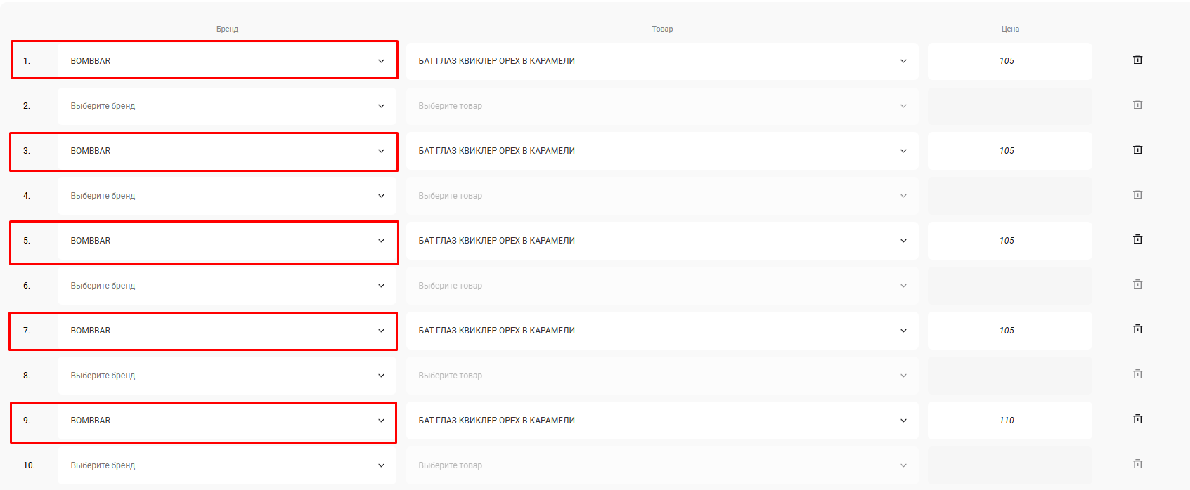 - Для каждой позиции необходимо указать свою цену.