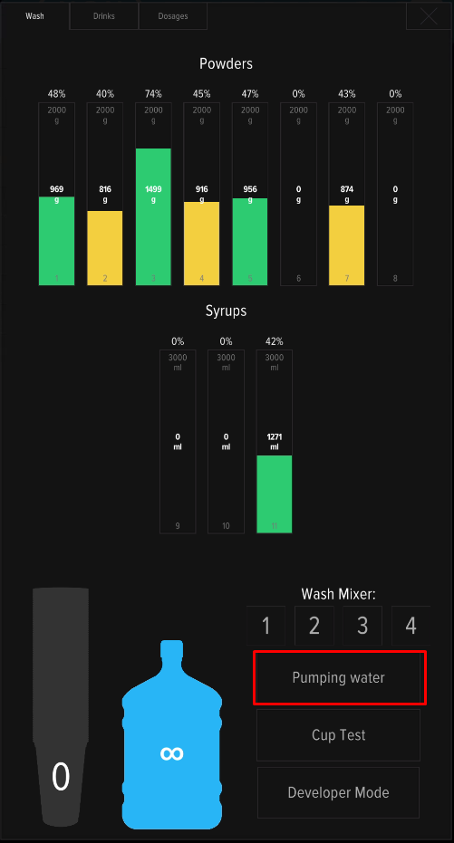 - Open the service menu and rinse the mixers by pressing buttons 1-4 on the screen one by one.