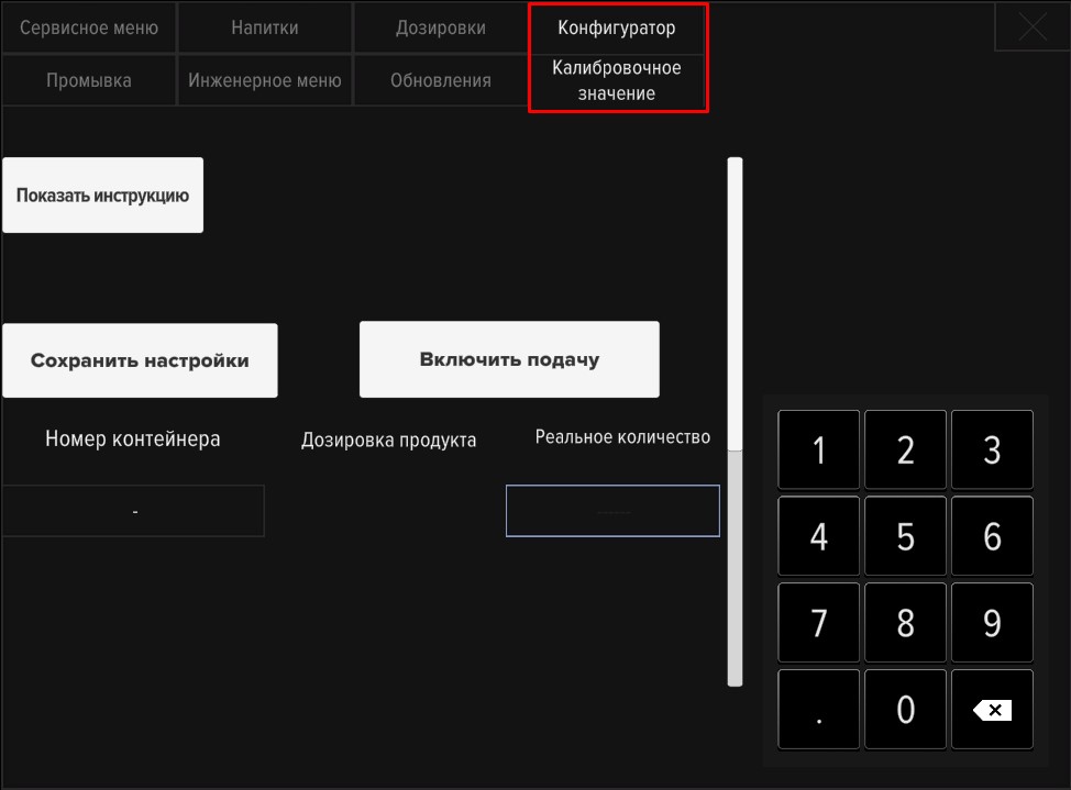 Калибровка состоит из выдачи продукта, взвешивания и ввода поправок на экране автомата. Откройте сервисное меню, во вкладке «Конфигуратор» откройте меню "Калибровочное значение" и следуйте инструкции на экране.
