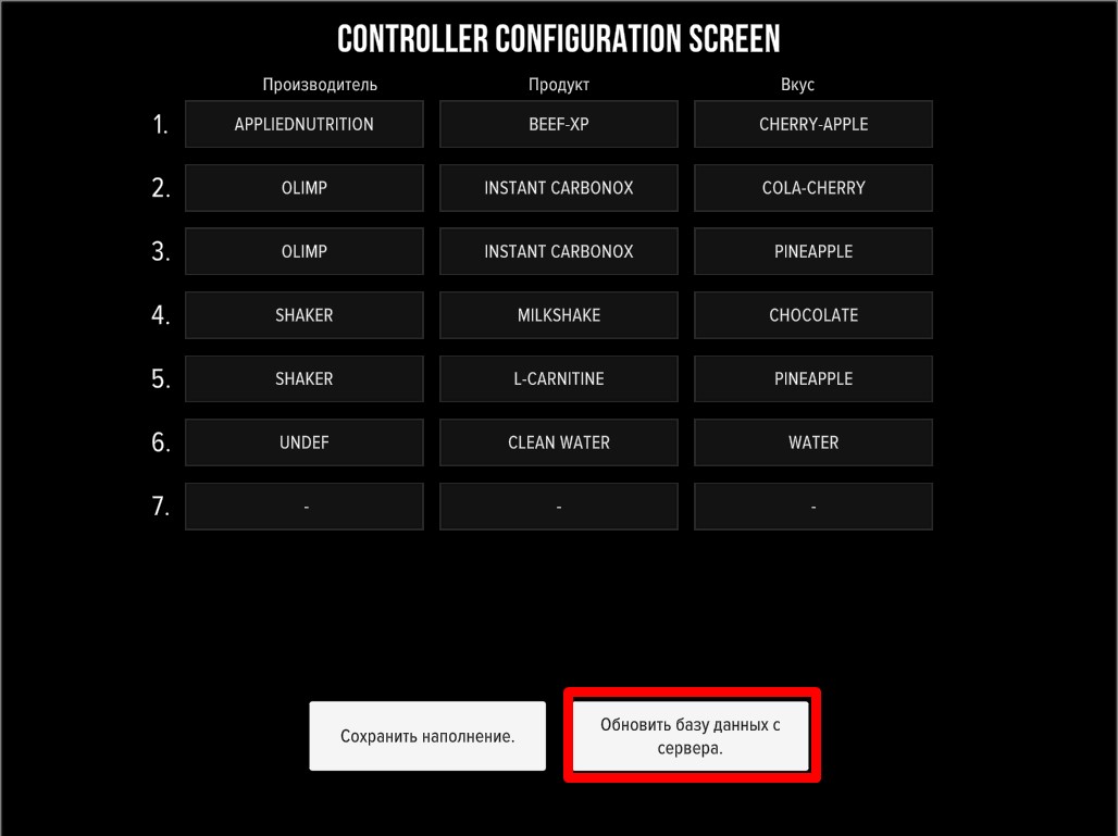 - Нажать на кнопку «Изменить напитки». При отсутствии нужных продуктов нажать "Обновить базу данных с сервера" (требуется подключение к телеметрии);