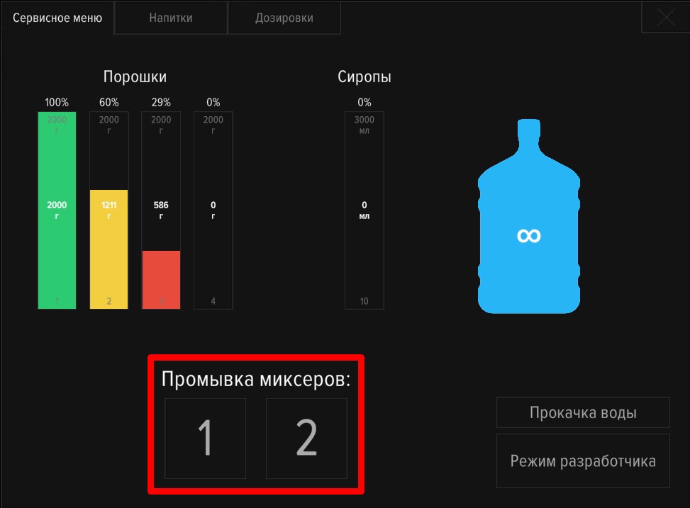- В сервисном меню установить значения остатка продуктов согласно наполнению контейнера.