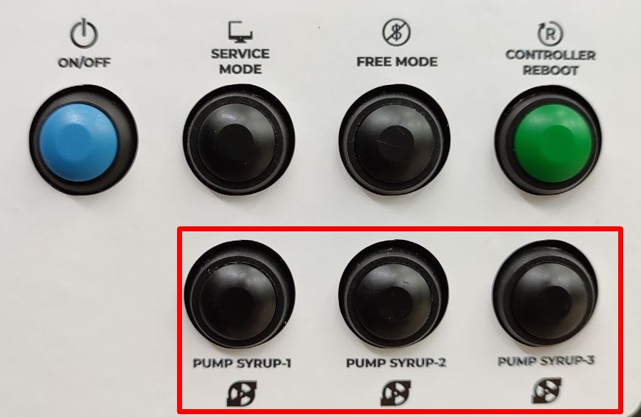 - Прокачать систему с помощью кнопок PUMP SYRUP на двери до выхода концентрата из шлангов налива