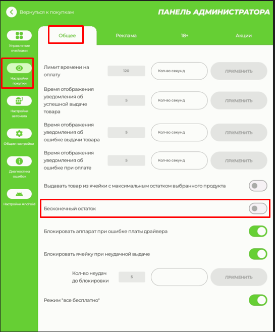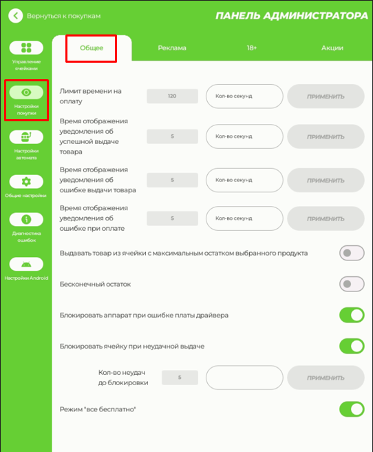 Для включения бесплатной выдачи товаров используйте опцию "Все бесплатно". ВНИМАНИЕ! По умолчанию данная опция активна и после подключения платежных устройств ее необходимо выключить. В случае, если режим будет выключен до момента подключения платежных устройств - экран покупки заблокируется ошибкой.