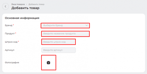 - Поле «Бренд» - название бренда товара (при отсутствии можно создать новый);