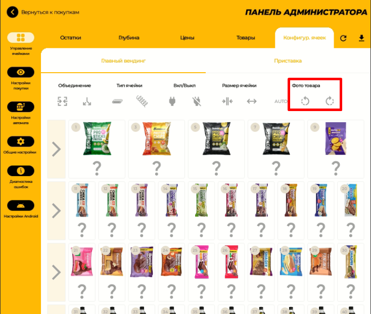 - Фотография товара - для корректного отображения на автомате нужно правильно повернуть картинку. Фото бутылок и длинных товаров повернуть в левую сторону. Вы можете повернуть картинку уже после загрузки, при необходимости можно заменить картинку или перевернуть в режиме редактирования товара. Фото товара также можно повернуть на экране автомата уже после загрузки БД - перейдите на экран Конфигурация ячеек вкладки Управление ячейками.