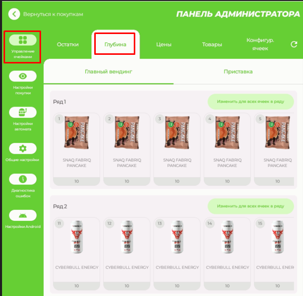 Откройте раздел "Управление ячейками" - "Конфигурация ячеек". Выберите одну или несколько ячеек и воспользуйтесь инструментами для объединения, разъединения, изменения типа или размеров ячеек. Конфигурация полок меняется автоматически - при наличии или отсутствии физического подключения жгута проводки к полке. Для изменения емкости ячеек перейдите на вкладку "Управление ячейками" - "Глубина".