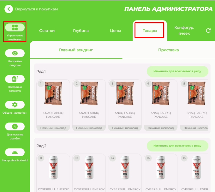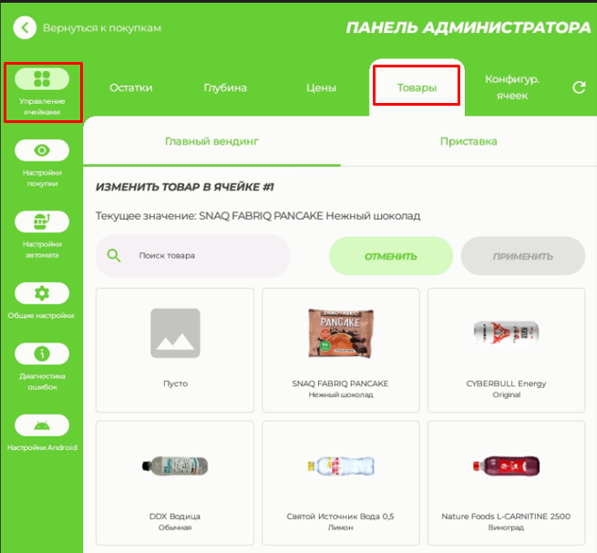 Откройте раздел "Управление ячейками" - "Товары". Для изменения товара в ячейке нажмите на нужную ячейку и введите название продукта в поисковой строке. Нажмите кнопку «Применить» для сохранения настроек.