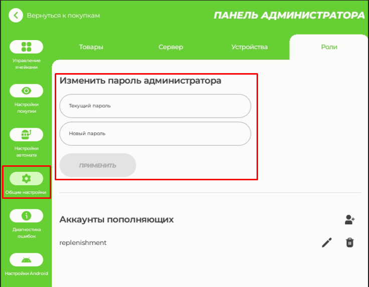 Выберите на боковой панели раздел "Общие настройки" - "Роли", дважды введите новый пароль администратора и нажмите кнопку «Изменить». После перезагрузки приложения авторизуйтесь с новым паролем.