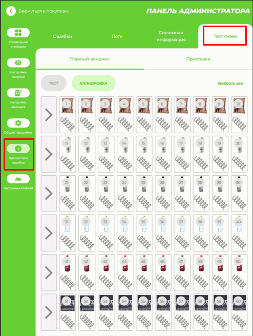 Откройте раздел "Диагностика ошибок" - "Тест ячеек". Для проверки отдельной любой ячейки выберите ее на матрице и нажмите «Тест». Для проверки работы всех ячеек нажмите «Выбрать все» и нажмите «Тест». В этом режиме автомат производит проверку работы мотора ячеек с включением оптодатчика - при отсутствии товаров на каждой ячейке появится ошибка выдачи (если датчик выдачи включен). Обращать внимание на это пока не нужно - просто убедитесь что все ячейки корректно отрабатывают цикл выдачи.