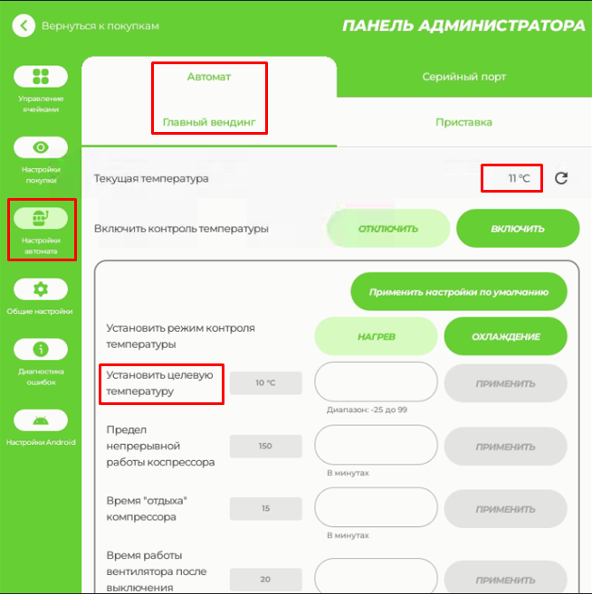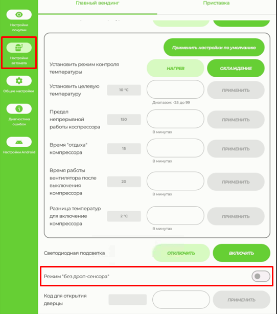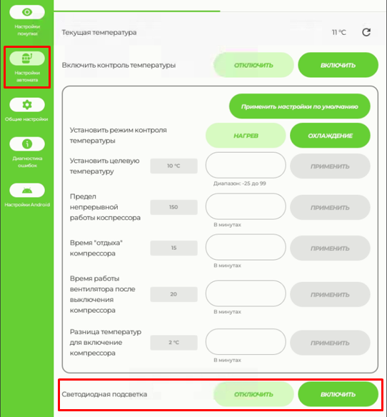 Настройки температуры, подсветки, оптодатчика выдачи товара