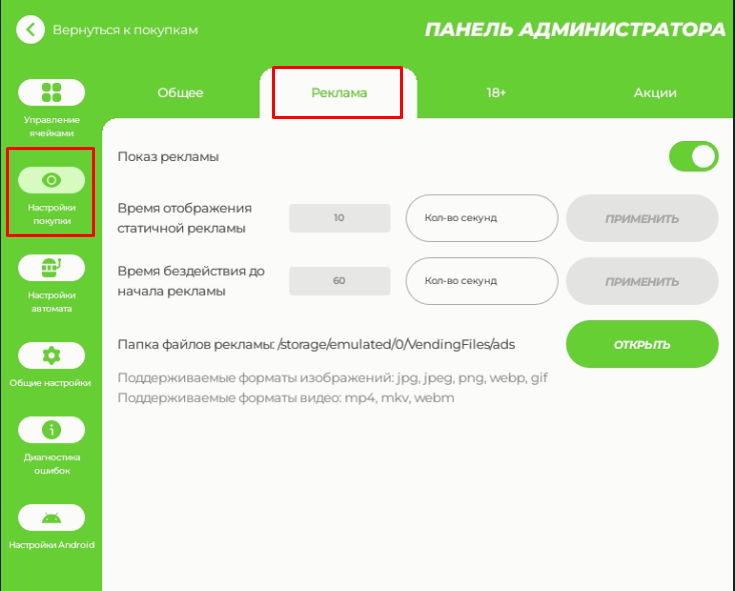 Откройте раздел "Настройки покупки" - "Реклама". Поддерживаются форматы: