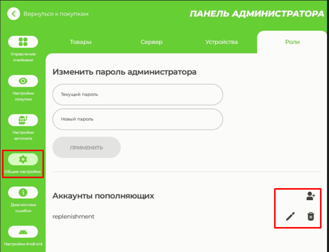 Выберите на боковой панели раздел «Общие настройки» - «Роли» и воспользуйтесь значками для добавления, редактирования или удаления аккаунтов пополняющих.