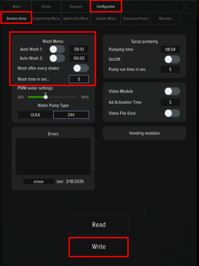 The timer washer flushes all the mixers of the machine at the specified time. The washing time is regulated by the «washing time per sec» field. To activate the option, click on the option selector and click the «Write» button.
